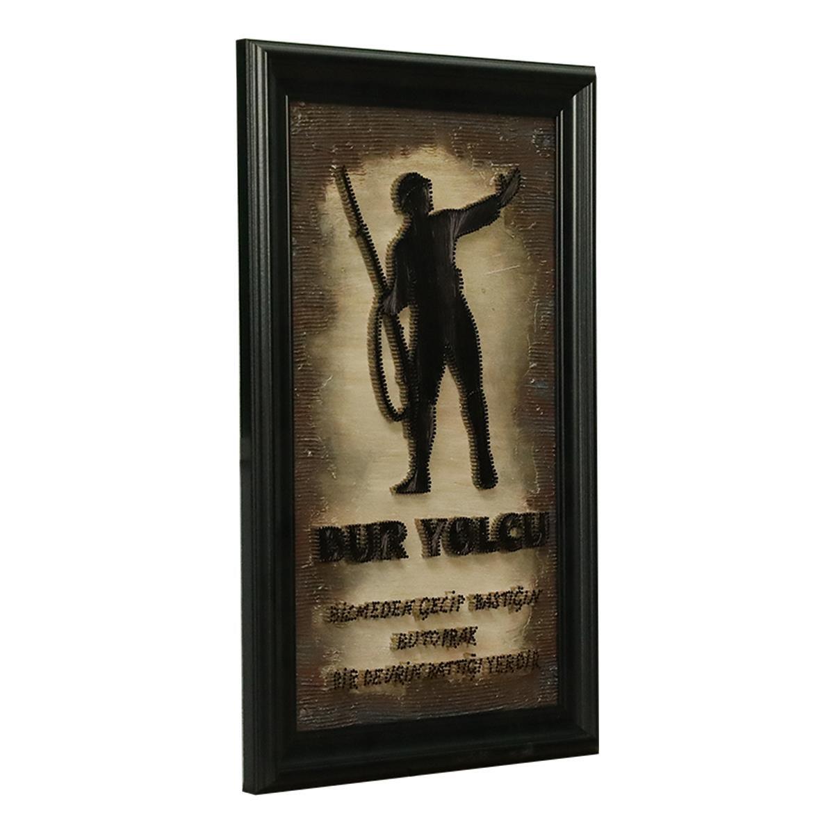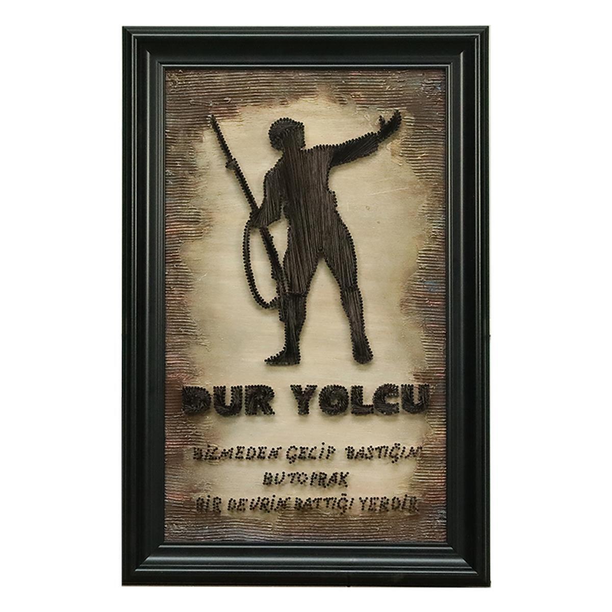 • Kavak contra, pasta rölyef, akrilik boya,çivi ve tel kullanılmış; ahşap zemine dekoratif ahşap süsleme teknikleri kullanılarak 18 Mart Çanakkale DUR YOLCU filografi teknikleriyle çalışılmıştır.
