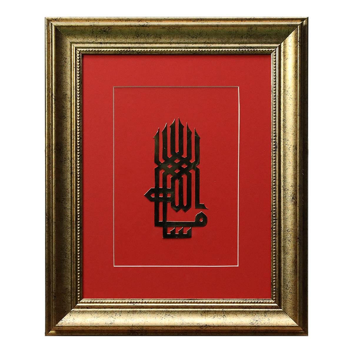 • Kırmızı Paspartu üzerine pirinç( sarı) plaka delme kesme tekniği ile KÛFİ MAŞALLAH yazılmıştır.