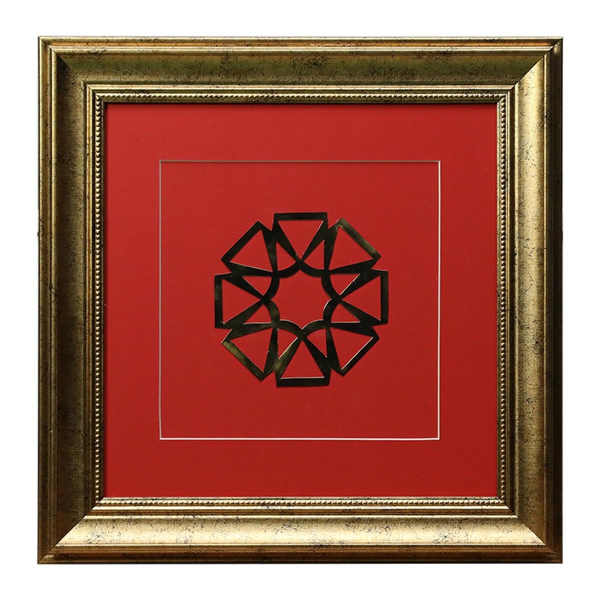• Kırmızı Paspartu üzerine pirinç( sarı) plaka delme kesme tekniği ile dekoratif desen çalışılmıştır.