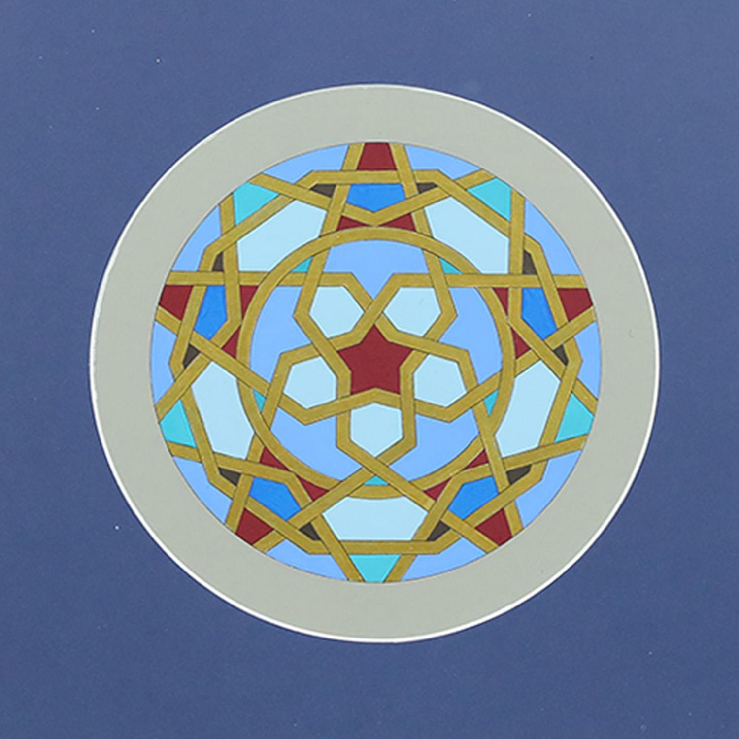 • The painting with a geometric medallion motif was created using metallic acrylic paints.