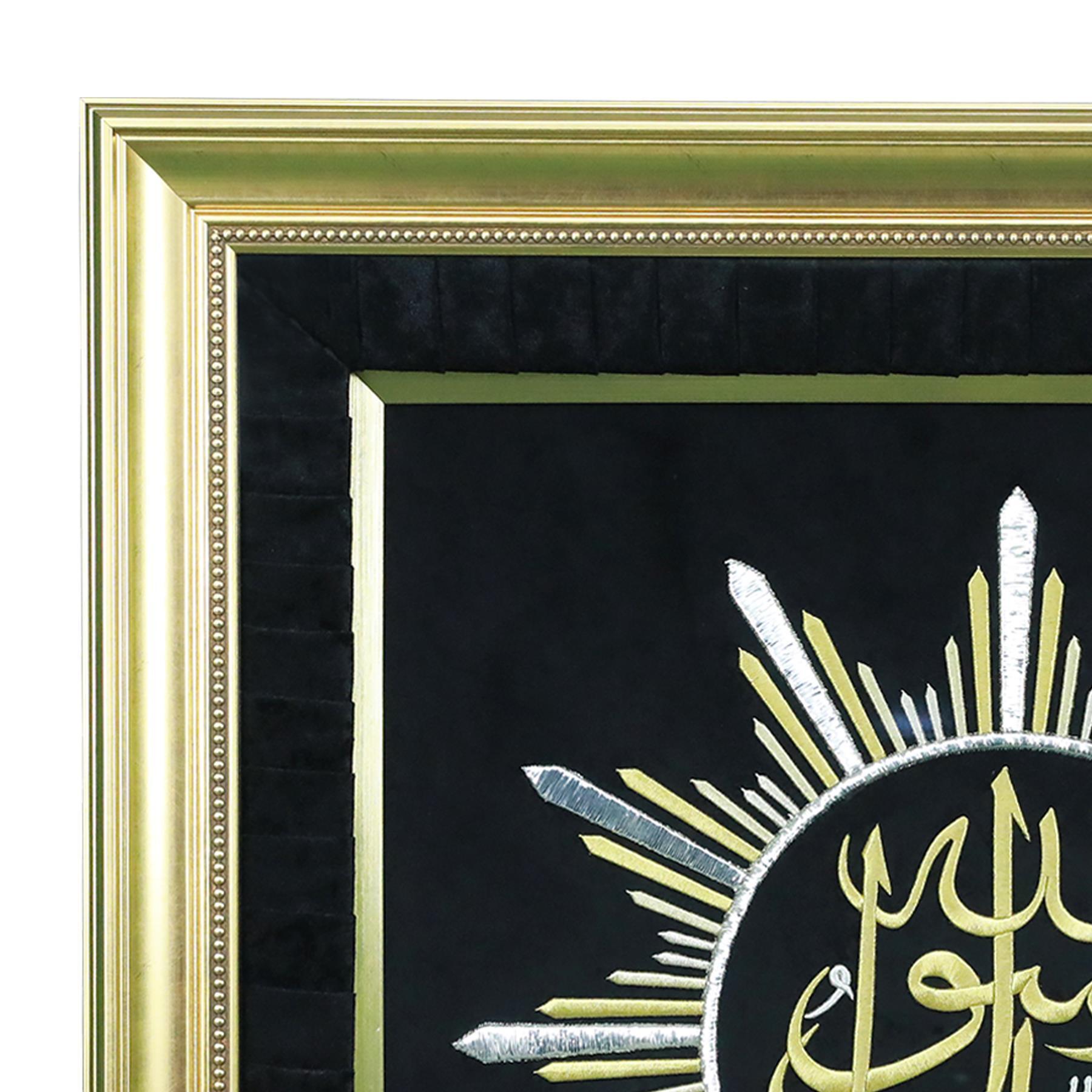 • تم تطريز لوحة عمل محمد رسول الله مرعش على قماش مخملي أسود باستخدام تقنية Maraş ، باستخدام سلك فضي وبريق أصفر ودرجات ألوان.