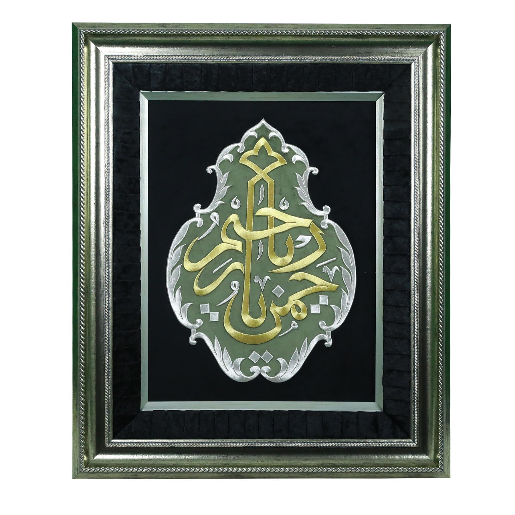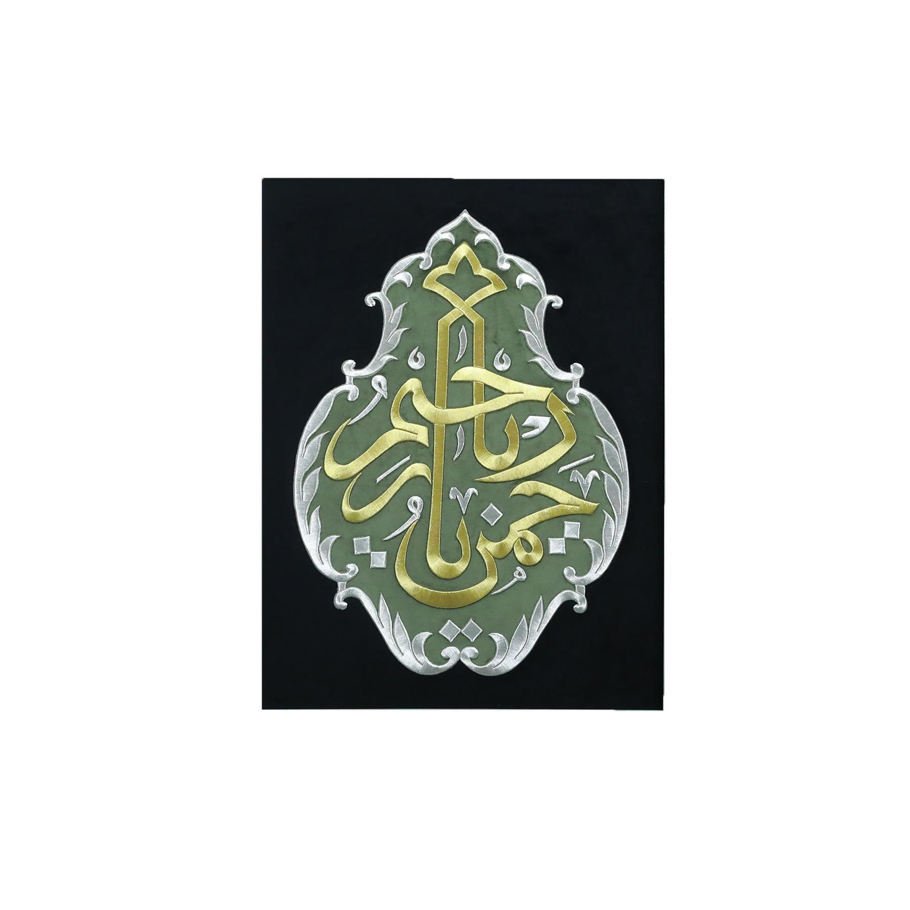 • عمل رحمن أو رحيم مرعش ، اللوحة مطرزة على قماش مخملي أسود بتقنية ماراش باستخدام بريق أصفر وفضي.